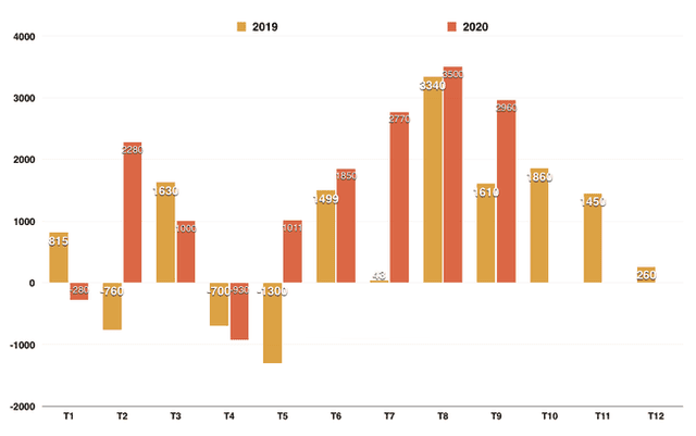 Cán cân thương mại của Việt Nam theo từng tháng giai đoạn 2019-2020 (đơn vị: triệu USD)
